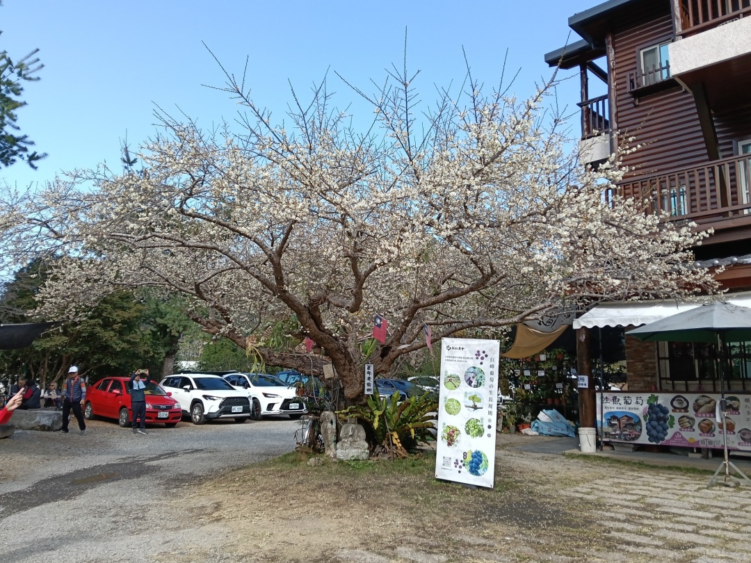 臺中新社每到梅花盛開,這裡就會擠入滿滿的遊客,老闆販售自家種的「鮭魚葡萄」、雜糧麵包、中西糕點與在地農產。門前庭院的梅樹正值花季,雪白花瓣點綴暖棕色的古樸木屋,如詩如畫的美景,真的是美不勝收,讓人駐足拍攝許多美麗的景色。