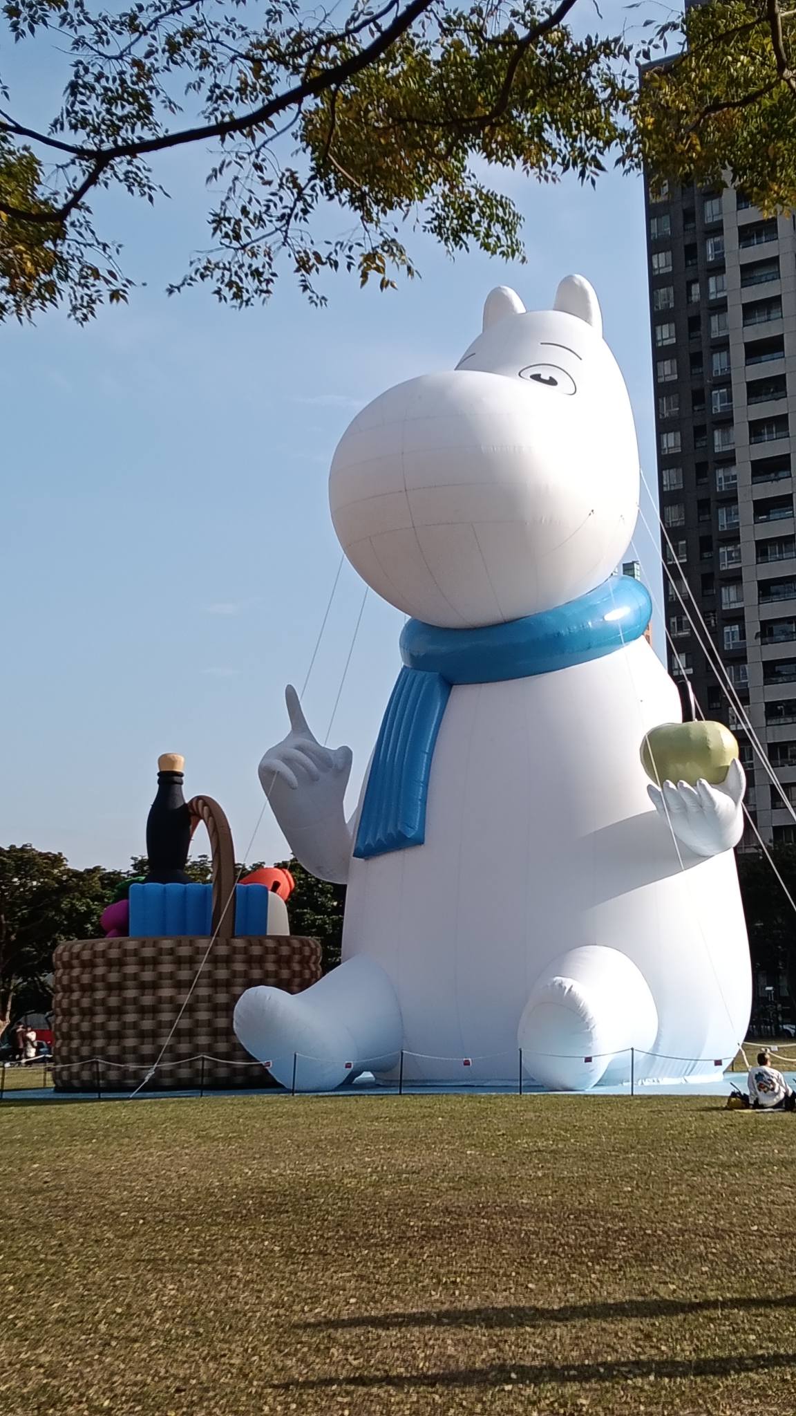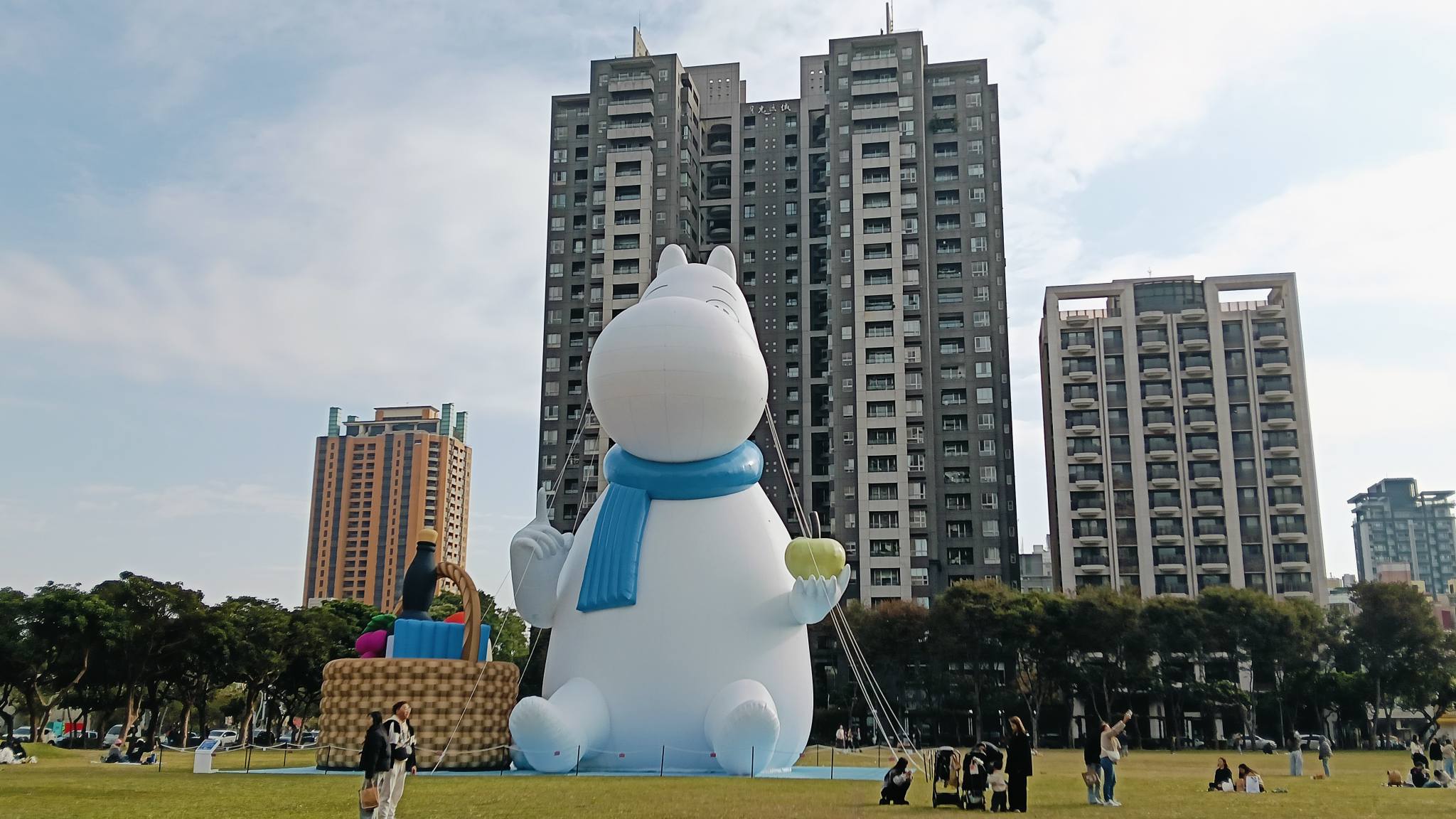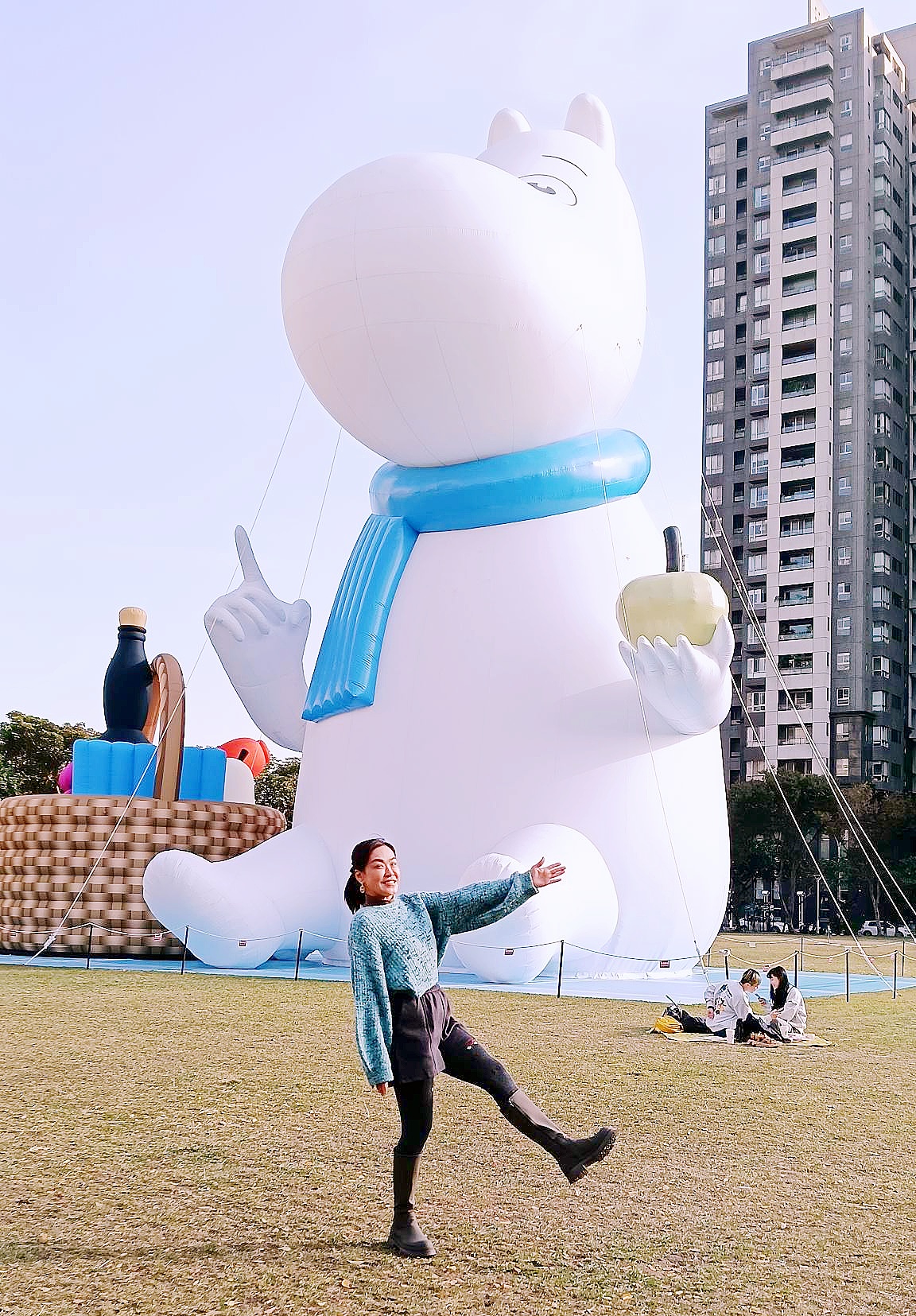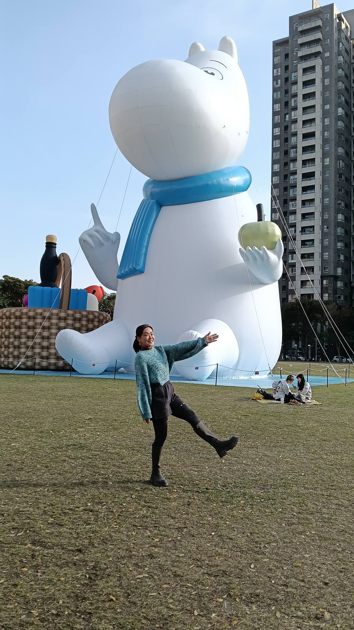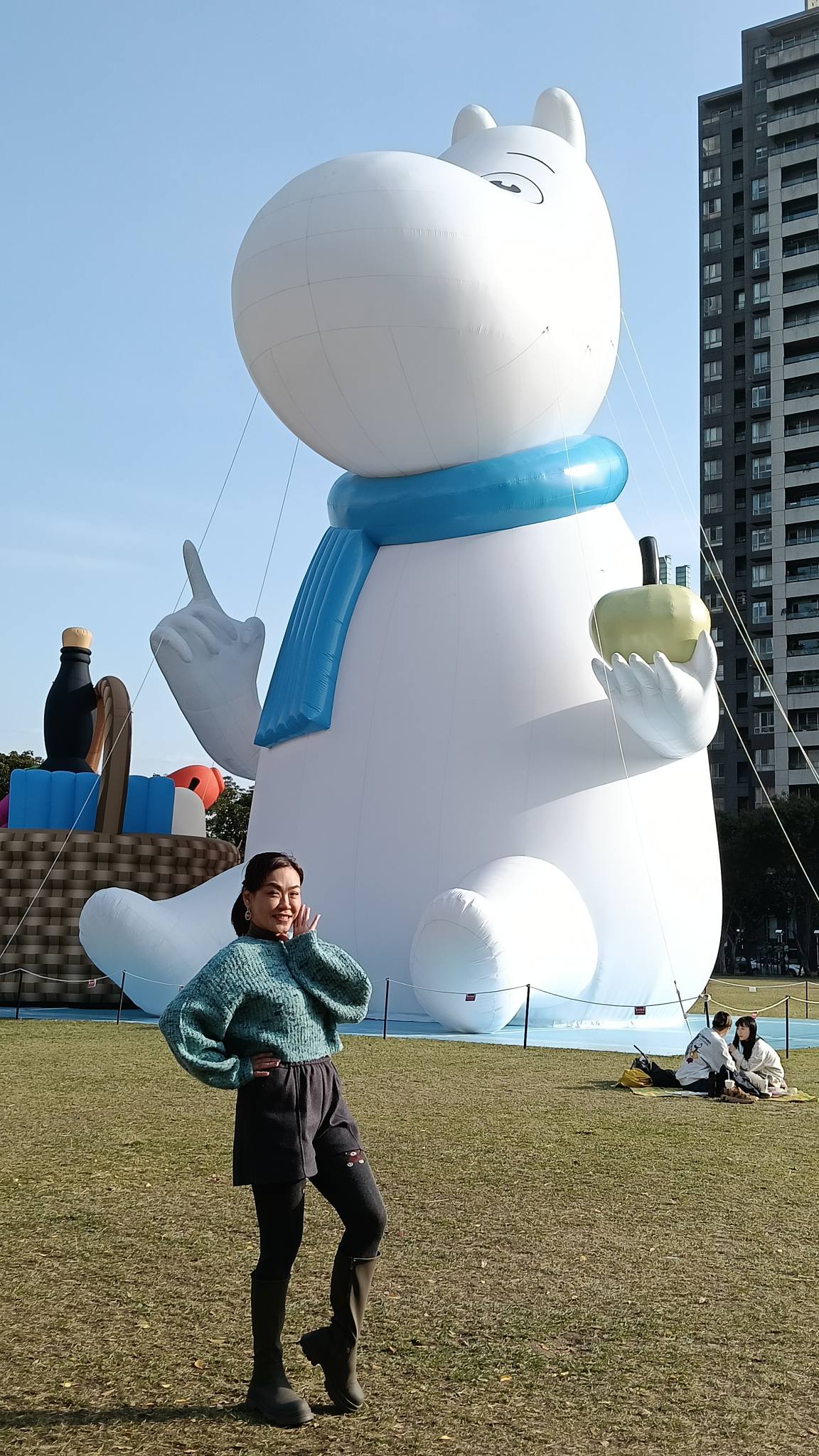 圍著藍色的圍巾(寒冷的冬天感覺非常保暖),左手拿著綠色的青蘋果(平平安安)💗嚕嚕米的右邊還放著野餐籃,在市民廣場優閒的坐著,也代表著台中每年都會辦市民野餐日,市民朋友利用時間可以放鬆一下,與家人朋友齊聚在一起,看著市民廣場四周的建設,欣欣向榮!