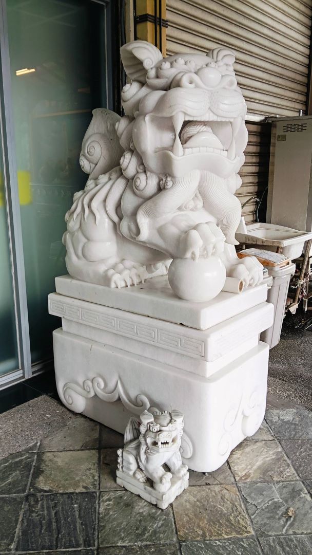 這兩尊大型的白獅子非常特別,前左足護兒的這尊是母獅,前右足玩球的這尊是公獅,一對獅子在門口當左右護法,詳細的歷史及典故,可以來到這裡有專業的嚮導為您解說喔!