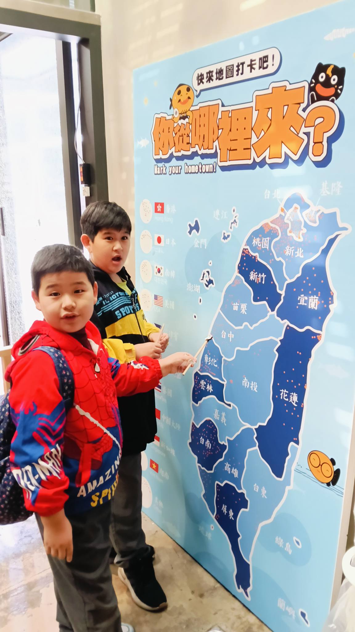 你從哪裡來?我們來自台中,這一趟的旅程有這巨型的台灣看板讓小朋友知道我們繞過半個台灣來到花蓮旅遊,我們也親眼在七星潭附近看到許多外國遊客,有日本、韓國、美國、香港、馬來西亞、泰國、大陸、新加坡、越南等遊客,都會來到我們台灣玩!當然我們也可以飛出去個個國家旅遊(來規劃一下出國行程也可以)這也是國際交流的首部曲喔!